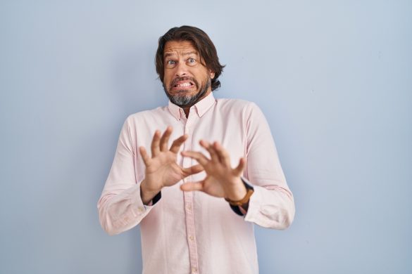 Autistic bearded man horrified by food near mouth